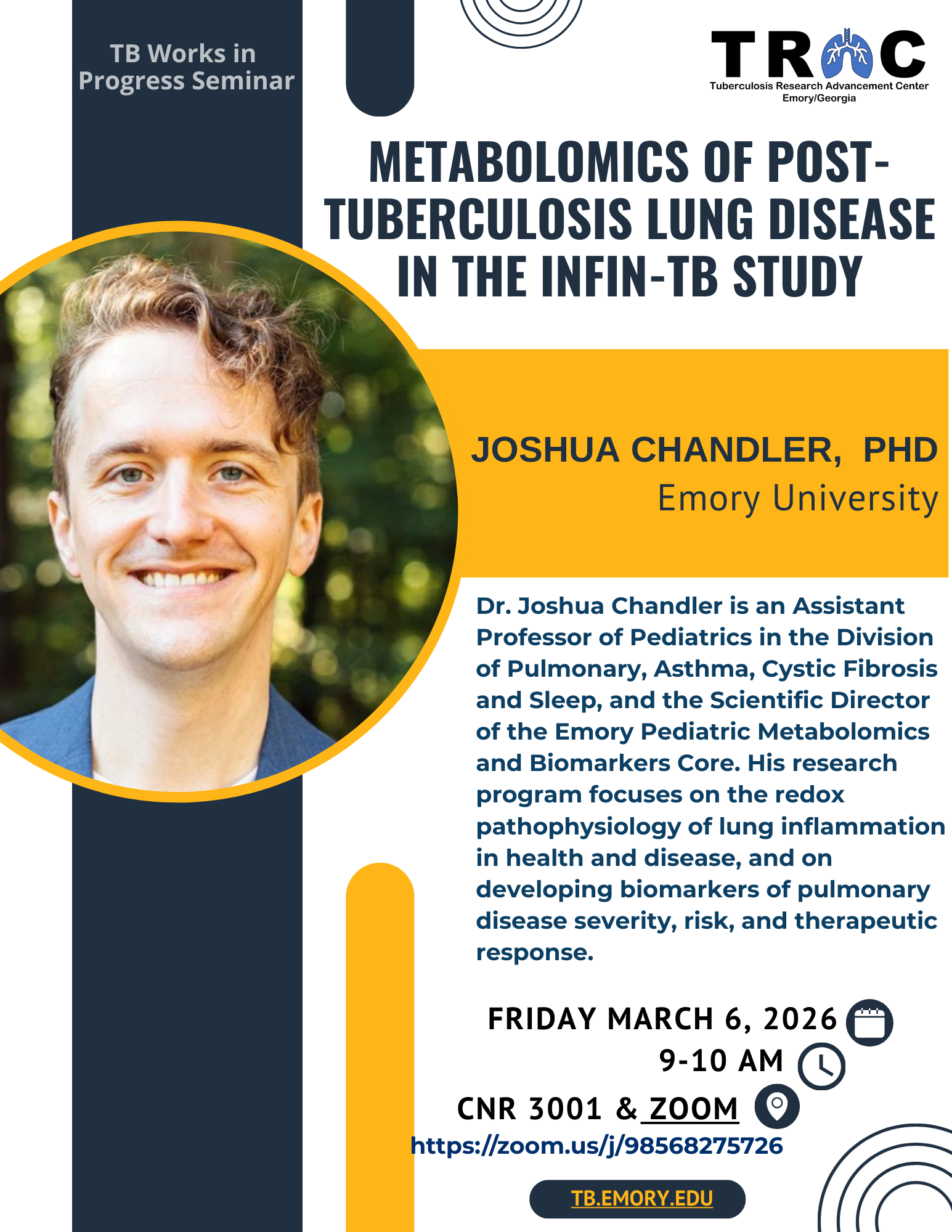 Joshua Chandler, PhD, Assistant Professor, Emory School of Emdicine, Division of Pulmonary, Asthma, Cystic Fibrosis and Sleep, and the Scientific Director of the Emory Pediatric Metabolomics and Biomarkers Core. "Metabolomics of post-tuberculosis lung disease in the INFIN-TB study". March 6, 2026, 9-10am EST. Rollins School of Public Health, CNR 3001 and via Zoom [Download Flyer | Add to calendar]